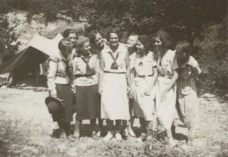 Szent-Györgyi első felesége, Demény Kornélia, "nagy" Nelli aktívan is részt vett a cserkészmozgalomban, erről az előző fejezetben már szó esett. A jobboldali fényképen mint a szegedi 77. sz. Thurzóné Zrínyi Kata egyetemi és főiskolai cserkész leánycsapat vezetője látható egy 1934-es Kács-Tapolcára tett kirándulás alkalmával.