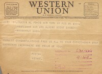 | Gratuláló távirat Szent-Györgyi Albertnek és feleségének amerikai állampolgárságuk elnyerése alkalmából | szgya_nobel_album_052_007_web | Család. Amerikai állampolgárság (Boston, 1955. február 21.). Pista gratuláló távirata. | Description: Család. Amerikai állampolgárság (Boston, 1955. február 21.). Pista gratuláló távirata. | ||