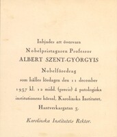 | Meghívó Szent-Györgyi Albert hivatalos Nobel-előadására a Karolinska Intézetbe | SzGyA_Nobel-eloadas_meghivo | Nobel-napok, Nobel-előadás. | Description: Nobel-napok, Nobel-előadás. | |||