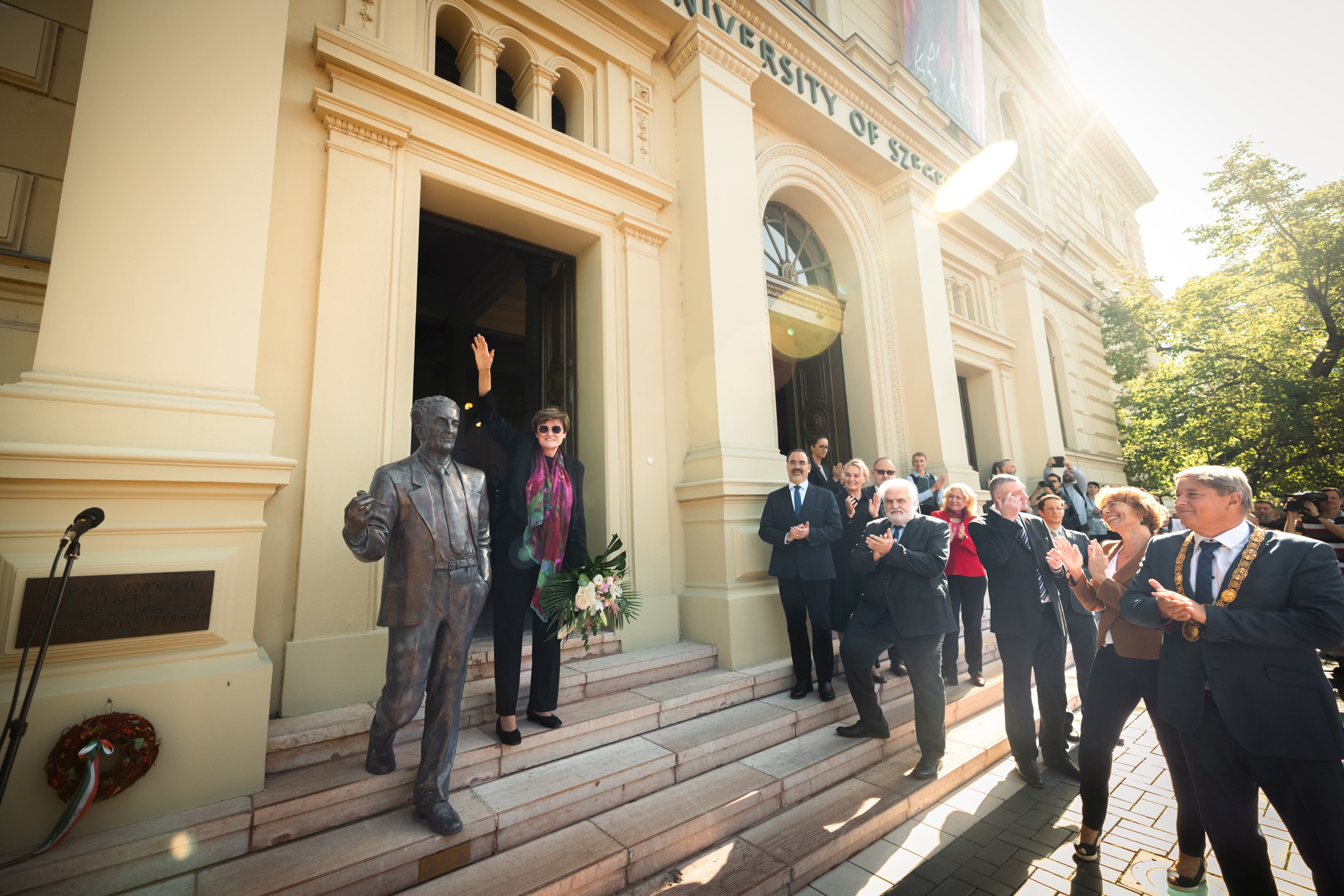 | Karikó Katalin Szegeden - Dugonics tér - Rektori Épület | Kariko_Katalin_Szegeden_003 | Karikó Katalint ünneplő tömeg fogadta Szegeden, a Dugonics téren. Az SZTE kutatóprofesszorát Szabó Gábor, a Szegedi Tudományegyetemért Alapítvány kuratóriumi elnöke, Rovó László, a Szegedi Tudományegyetem rektora, Fendler Judit, a Szegedi Tudományegyetem kancellárja, Botka László, Szeged város polgármestere és Salgó László, a Csongrád-Csanád Vármegyei Kormányhivatal főispánja köszöntötte az egyetem központi épülete előtt. Ezt követően Karikó Katalin tiszteletére zártkörű ünnepi ülést rendezett az egyetem, amelyen részt vettek a Szegedi Tudományegyetemért Alapítvány kurátorai, az egyetem rektorhelyettesei, főigazgatói, igazgatói, a karok megjelent dékánjai, dékánhelyettesei is. A program sajtónyilvános beszélgetéssel folytatódott a díszteremben, Karikó Katalint Újszászi Ilona, az SZTE senior kommunikációs szakértője kérdezte. | Description: Karikó Katalint ünneplő tömeg fogadta Szegeden, a Dugonics téren. Az SZTE kutatóprofesszorát Szabó Gábor, a Szegedi Tudományegyetemért Alapítvány kuratóriumi elnöke, Rovó László, a Szegedi Tudományegyetem rektora, Fendler Judit, a Szegedi Tudományegyetem kancellárja, Botka László, Szeged város polgármestere és Salgó László, a Csongrád-Csanád Vármegyei Kormányhivatal főispánja köszöntötte az egyetem központi épülete előtt. Ezt követően Karikó Katalin tiszteletére zártkörű ünnepi ülést rendezett az egyetem, amelyen részt vettek a Szegedi Tudományegyetemért Alapítvány kurátorai, az egyetem rektorhelyettesei, főigazgatói, igazgatói, a karok megjelent dékánjai, dékánhelyettesei is. A program sajtónyilvános beszélgetéssel folytatódott a díszteremben, Karikó Katalint Újszászi Ilona, az SZTE senior kommunikációs szakértője kérdezte. [show more] | ||
