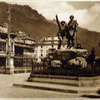 Chamonix : Saussure emlékszobra háttérben a Mont Blanc nyúlványai