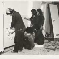 Hallgatólányok homokzsákokat készítenek az árvízi védekezéshez