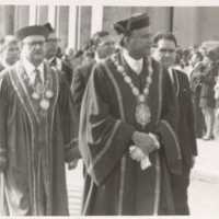 A József Attila Tudományegyetem dékánjai Szeged utcáin vonulnak át a Városi Tanács dísztermébe a díszdoktor avató tanácsülésre
