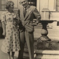 Szent-Györgyi Albert és családjának hölgytagjai a központi egyetemi épület lépcsőjén, Szent-Györgyi díszdoktorrá avatására érkezve