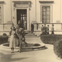 Szent-Györgyi Albert családjának hölgytagjai a központi egyetemi épület lépcsőjén, Szent-Györgyi díszdoktorrá avatásának napján