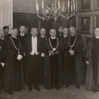 Szent-Györgyi Albert, a szegedi egyetem frissen felavatott díszdoktora az egyetem vezetőinek társaságában
