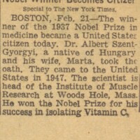 Nobel winner becomes citizer : sajtóhíradás Szent-Györgyi Albert és felesége amerikai állampolgárságáról