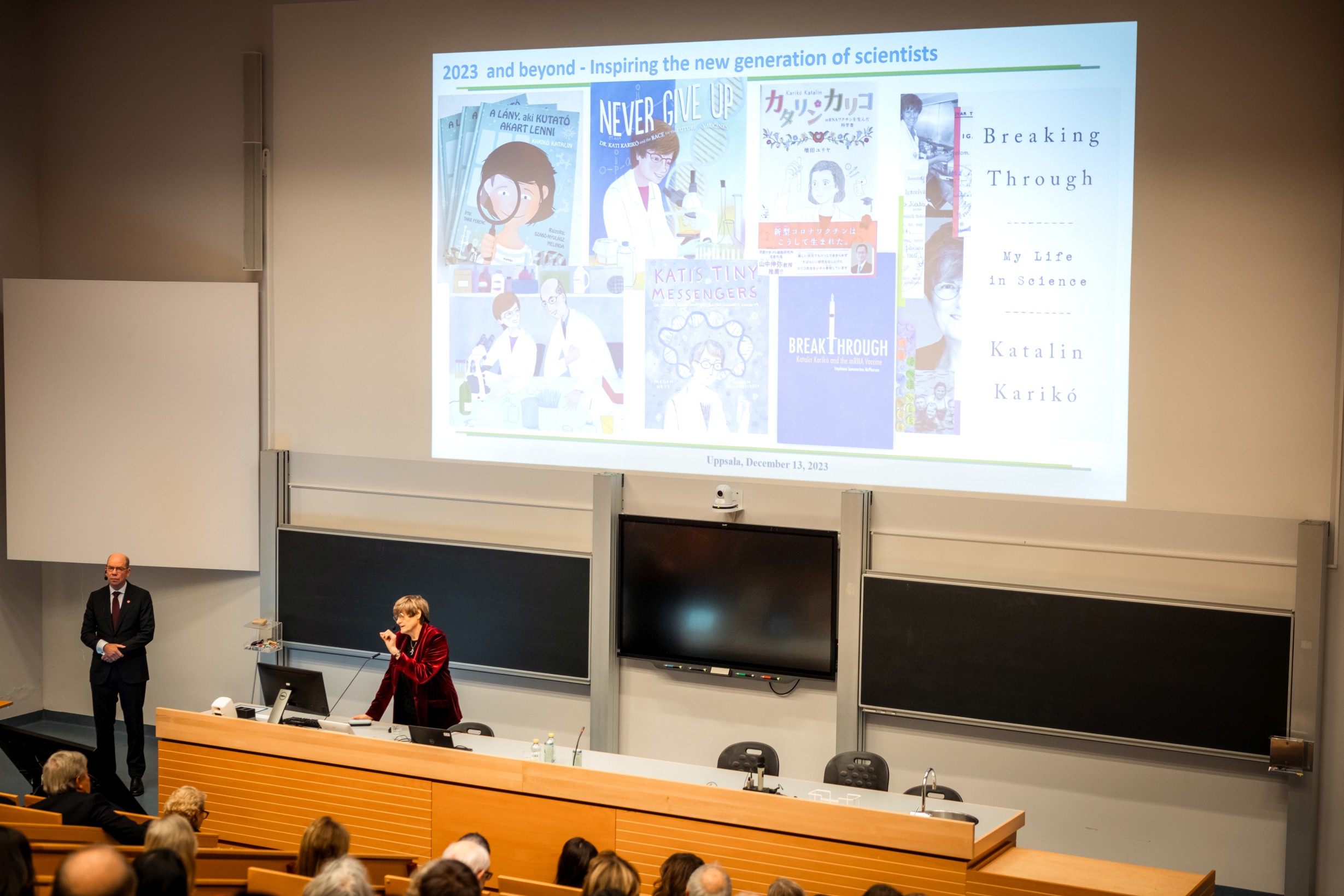 Évek óta hagyomány, hogy az újonnan megválasztott Nobel-díjasokat meghívják az Uppsalai Egyetemre - ez része a Nobel-díjhoz kapcsolódó rendezvénysorozatnak. Karikó Katalin december 13-án tartott előadást, több Nobel-díjassal együtt. Az előadás élőben volt követhető.